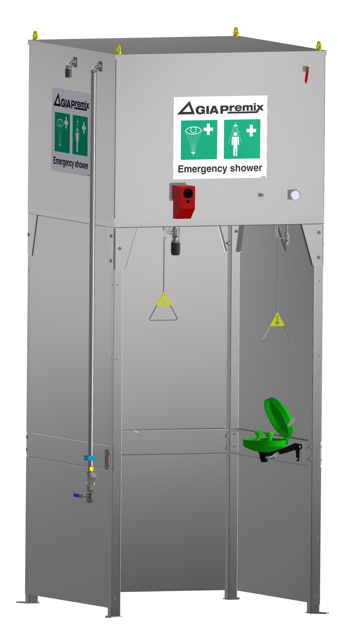 Levereras komplett med dragförlängare för aktivering av krypande/liggande person, efterlysande nödduschskylt, kontrollkort, väggkonsol, måttritning samt skötsel och driftinstruktion.